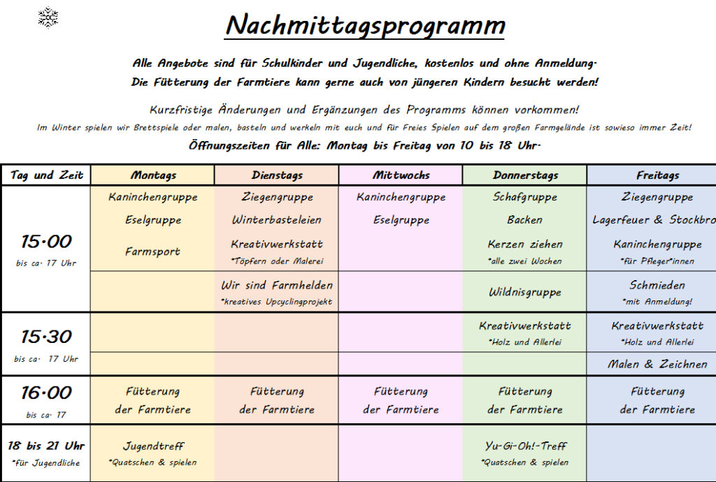 Der letzte Farmtag in diesem Jahr ist der 22.12.22, den wir mit einer kleinen weihnachtlichen Feier für Kinder und Jugendliche ab 15 Uhr abschließen werden.